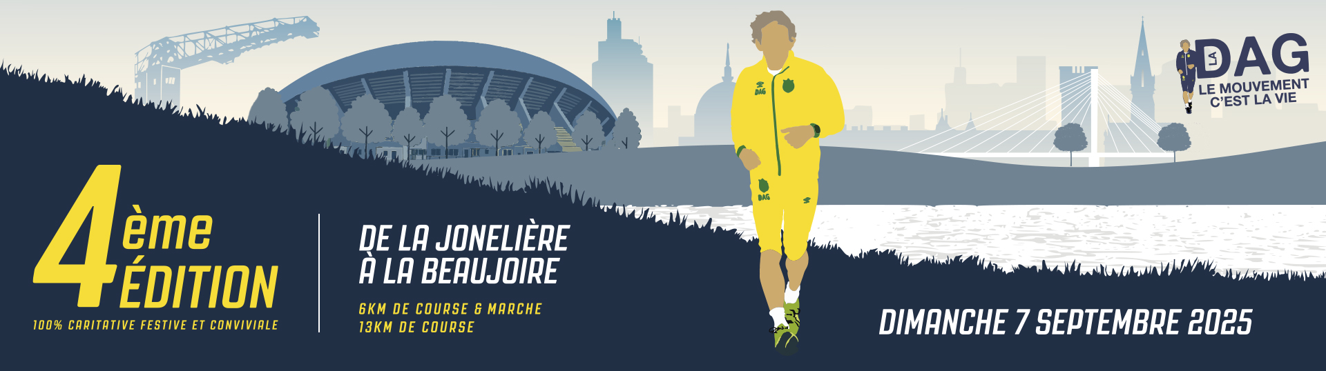 Après une édition 2024 marquée par un bel engouement et 1964 participants, La DAG revient pour une 4ᵉ édition toujours aussi fédératrice et solidaire ! Organisée par l’association Les Amis de DAG, cette course caritative rend hommage à Philippe Daguillon, kiné emblématique du FC Nantes disparu en 2018 des suites d’un cancer. Chaque inscription contribue directement à soutenir des projets au profit des patients atteints de cancer, en partenariat avec le Fonds de dotation du CHU de Nantes