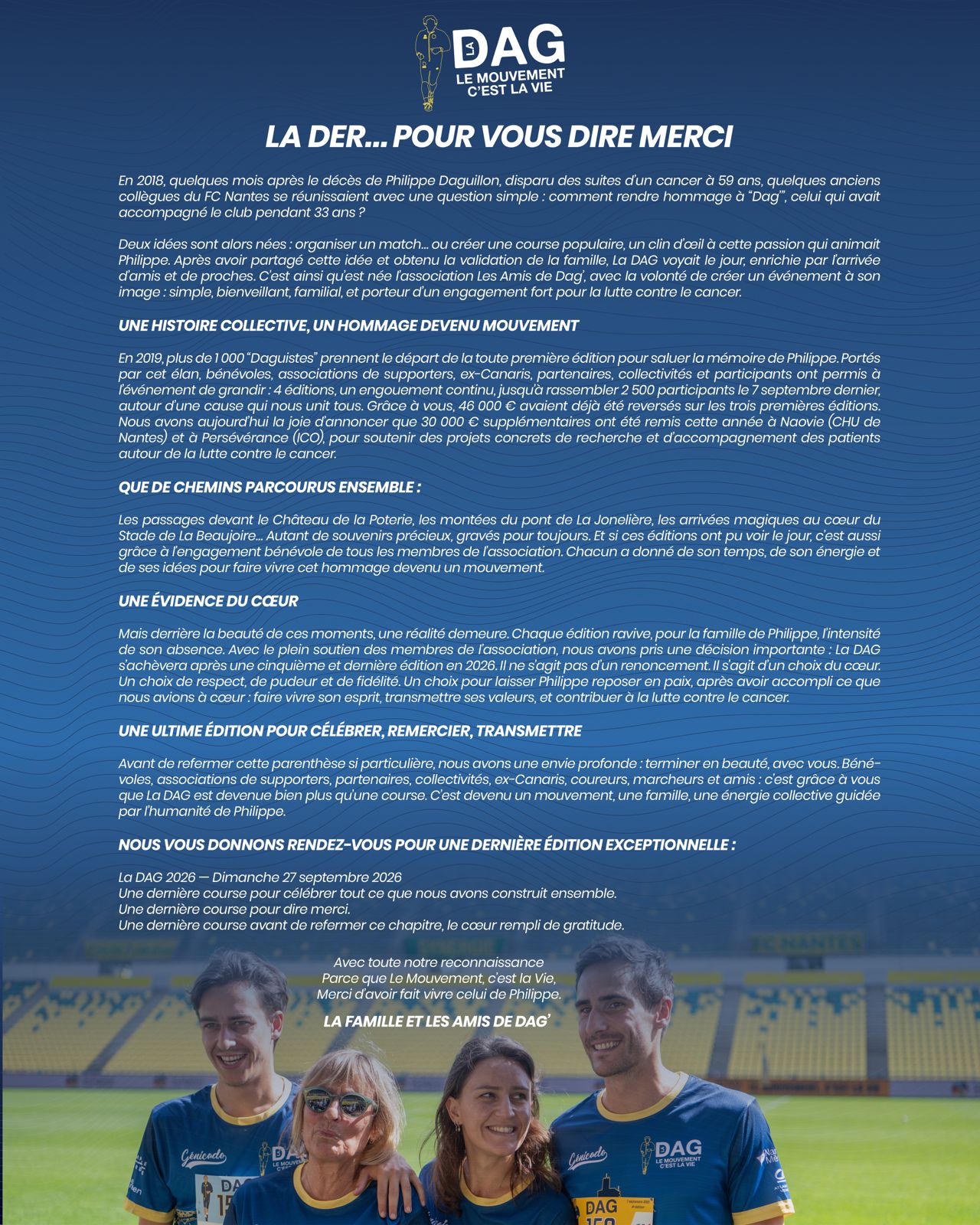 Après une 4ème édition 2025 mémorable, La DAG revient pour une 5ᵉ et… dernière édition ! Organisée par l’association Les Amis de DAG, cette ultime course rendra hommage à Philippe Daguillon, kiné emblématique du FC Nantes disparu en 2018 des suites d’un cancer. Chaque inscription contribue directement à soutenir des projets au profit des patients atteints de cancer, en partenariat avec le Fonds de dotation du CHU de Nantes.
